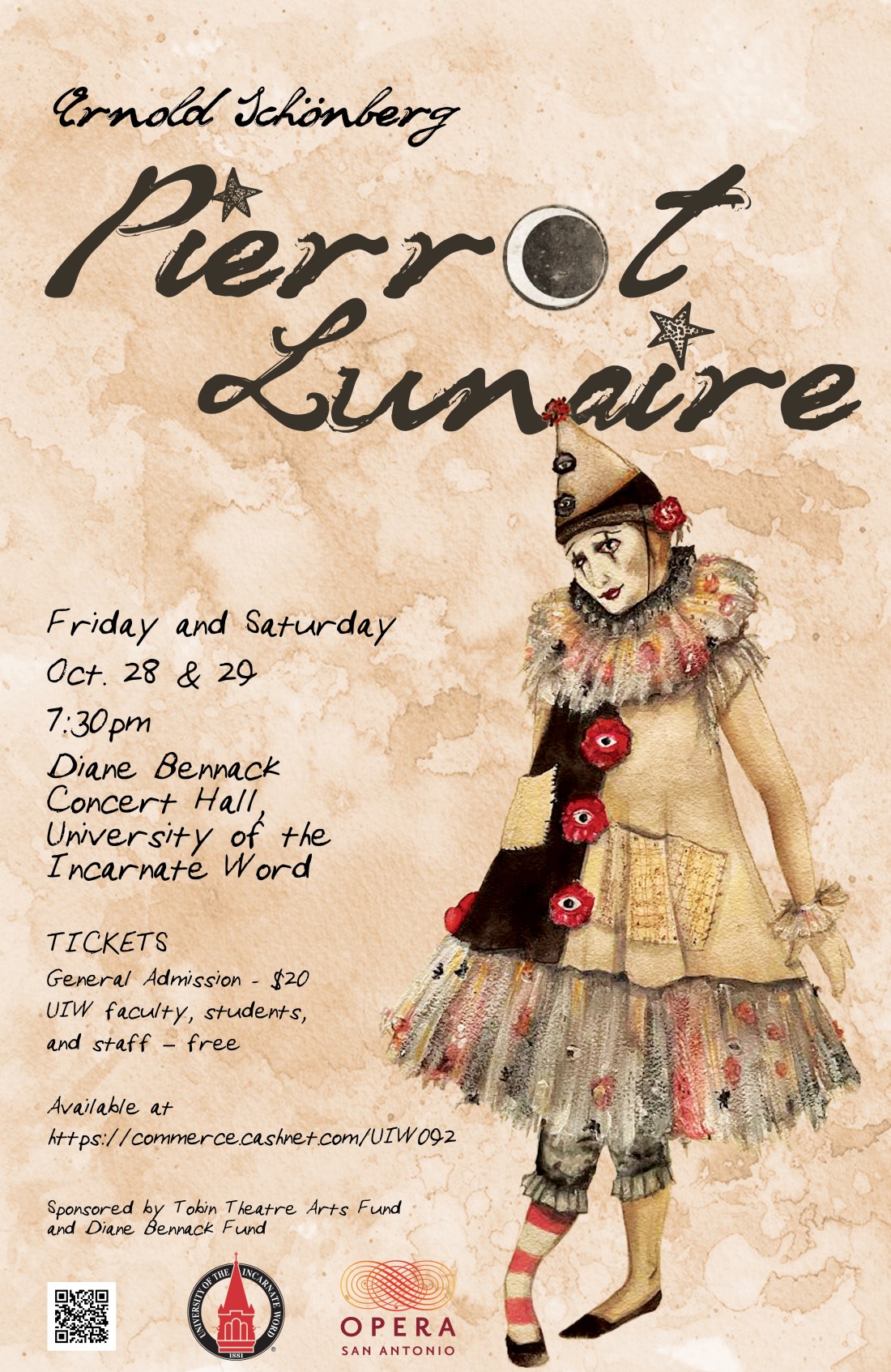And that’s what we come back for, isn’t it? The music showing us, bizarrely suggesting to us the world of this bizarre poetry. In “Mondestrunken” Schoenberg shows us as much as he can: the twinkling of the wine-light, falling in the piano, with drops of the stuff plunking in the pizzicato violin. The rush and trilling flute flutter of the high-tide of moonwine, the throaty yearning gestures in the violin sounding the poet’s sweet and gruesome longing. The ensemble eruption of the poet in ecstasy, the strings’ soaring with the poet’s head, lifted moonwards to drink in as much as possible, the grotesque gurgling as it floods the body – that moonwinelight, imbibed through the eyes. This is the first and quasi-prophetic part of the ritual, in anticipation of the staged production – on October 28 and 29, 2022, in San Antonio, Texas, at the University of the Incarnate Word. Full of anticipation, we raise our heads heavenward to quaff Schoenberg’s heady brew.