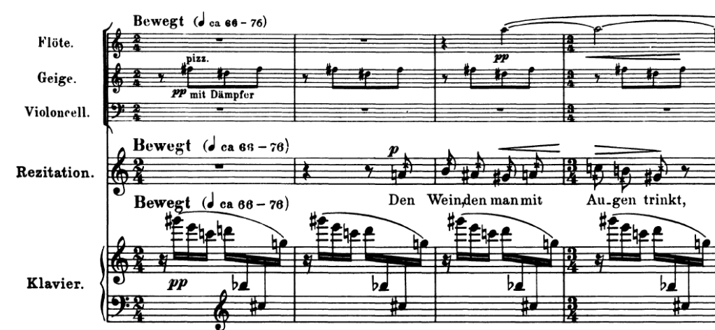 But about that Sprechstimme F sharp. . . One of the other strange things about it – other than the fact that sustaining Sprechstimme on a pitch makes it singing more than Sprechstimme – is its very length: a half note tied to an eighth. This note, on the word Mutter, is the movement’s longest agogic accent, made more dramatic by contrast with the much faster and frankly unrelenting rate of text delivery in much of the rest of the movement. Possibly a vocalist wouldn’t forgive me for this, but it almost seems like she is mumbling for most of the movement or, at best, carrying on an internal dialogue that suddenly erupts into a public declaration in the final stanza. Inner/outer, private/public, hidden/revealed. But what on earth does it have to do with Pierrot? Is Mary’s wound one of convenience, capitalized on for self-pity’s sake? Or is the proposal that this is the wound we must understand to gain wisdom: the Ur-wound, the sign of signs at the center of history? Back to Wagner. . .