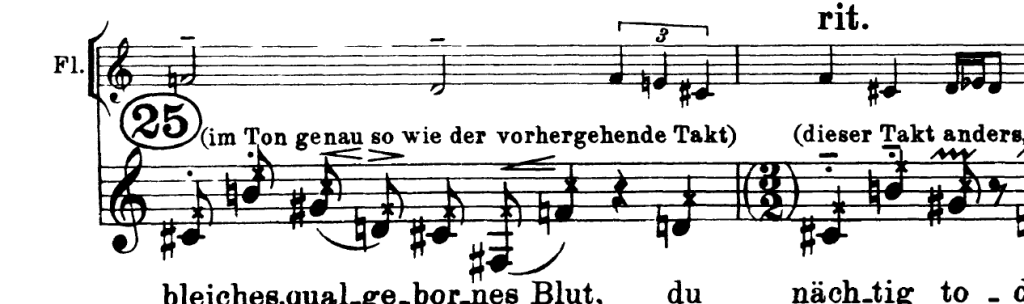 It may not seem much of a claim to say that “Der kranke Mond” is singular in a work that features a different deployment of instruments in each movement. Even so. . .it is singular – of twenty-one songs, it’s the only one for voice and a single instrument, and a linear one at that: the flute. (No. 14, “Die Kreuze,” which closes the second part of the cycle, starts with an art song texture of piano and voice, but at a crucial moment gains the full ensemble, on which more later.) Like each instrument in the cycle, the flute (doubling piccolo) has a unique role in Pierrot lunaire. It’s often enlisted, frequently in tandem with the piano in its upper range, to elicit various qualities of light, from beams to liquid light to flecks. And I’m afraid this brings us to the doorstep of a vast domain (Think Bluebeard’s Castle. . .), the question of to what extent the signification that adheres to timbre stays in place, takes part in a cosmogony of sound color, somewhere on an individual-to-cultural-to-universal continuum.